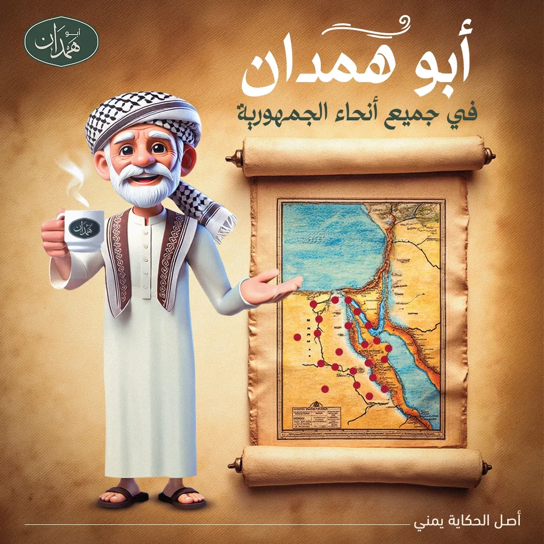 In the heart of Yemen, a man named "Abuo Hamdan" was born. He had many stories and secrets in his bag, but what distinguished this man most was his deep love for Yemeni coffee, which has always been a symbol of generosity and authenticity in his country. Abuo Hamdan dreamed of bringing this famous coffee to Egypt so that crowds would gather around cups of coffee in the councils.